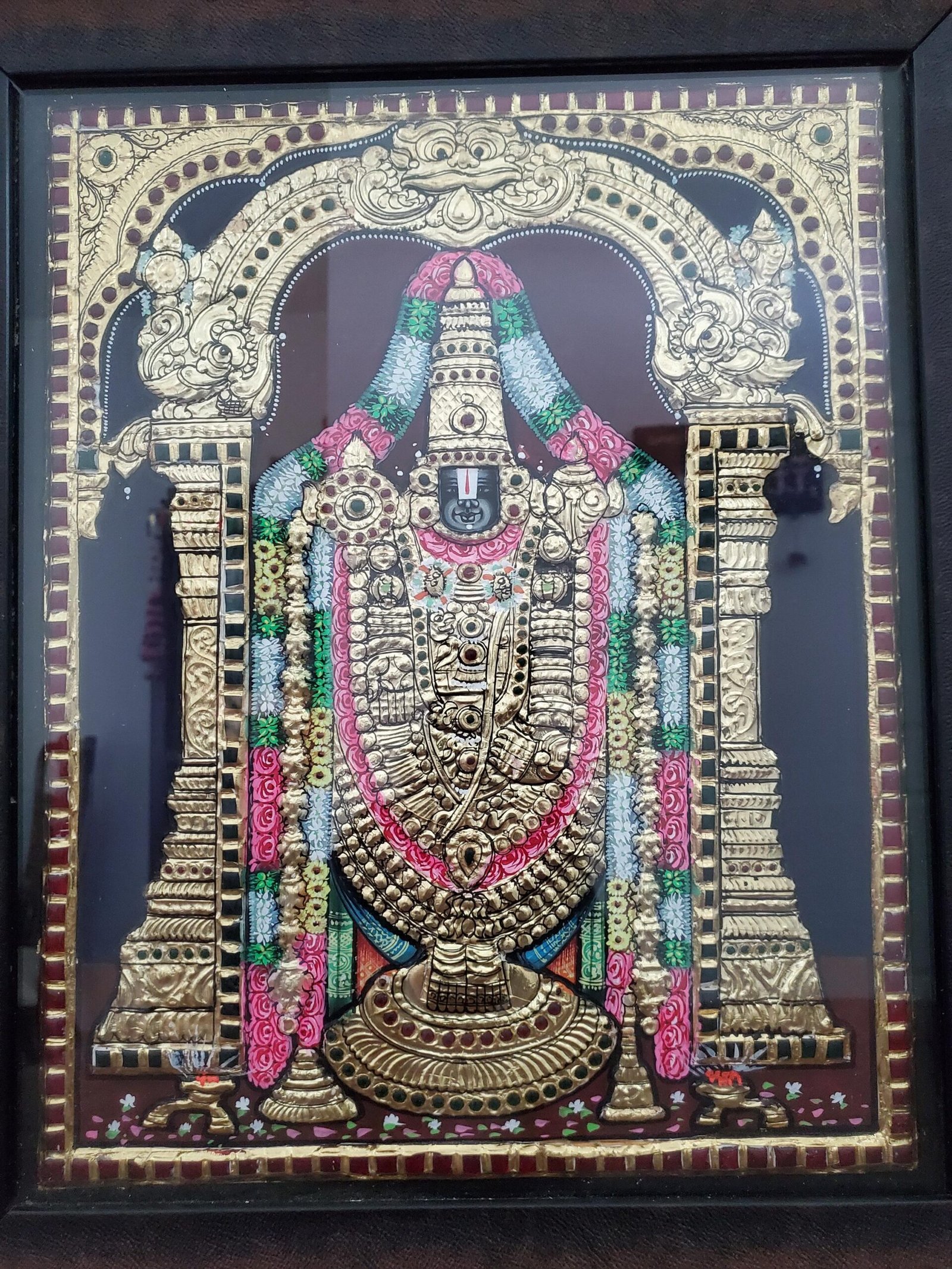 Venkateshwara Tanjore Art made with Gold foil sheet and framed with Glass.